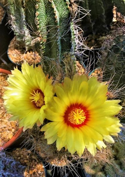 The Astrophytum capricorne typically has 7 - 8 ribs. As pictured, spines are contorted, wirey, twisted, curved and flattened. Spines are 2" - 4" in length. As this species matures, its spines tend to become more and more wild. Flowers are yellow with red centers (pictured above). These stunning flowers carry a sweet and pleasant smell.